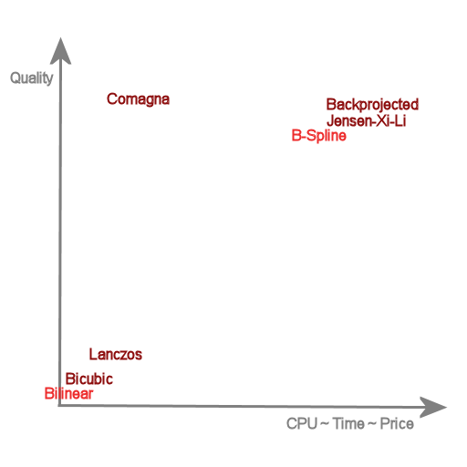 [1]Peak Signal to Noise Ratio is a mathematical metrics to measure how well the method approximates the original image. Small improvements often represent drastic improvement in percieved quality. Subjective visual comparision however may not correspond to better PSNR values. [2]Speeds below 0.1 sec cannot be well measured due to random (stochastic) events of file I/O and other factors. | ||